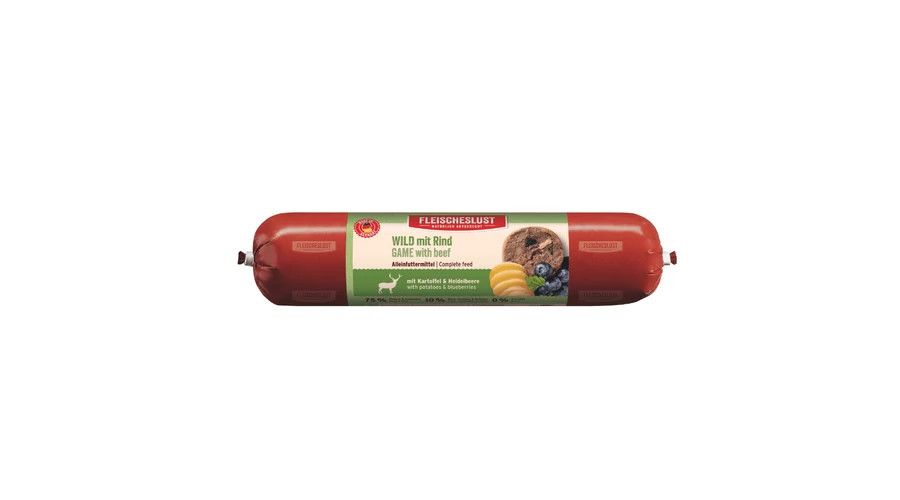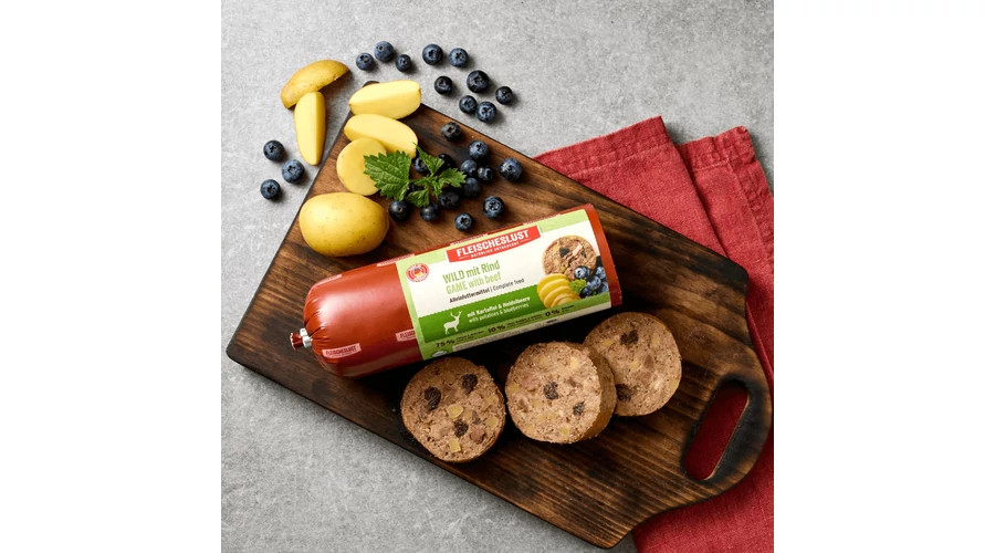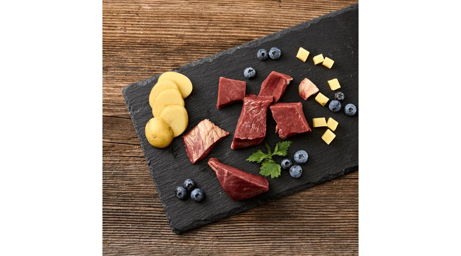 Összetevők: 40% szarvas (izomhús), 35% marha (tüdő, szív, tőgy), 9% húsleves, 5% áfonya, 5% burgonya, burgonya keményítő, ásványi anyagok, tojáshéjliszt, sörélesztő, 0.2% lenmagolaj, 0.1 % csalán, yucca gyökér